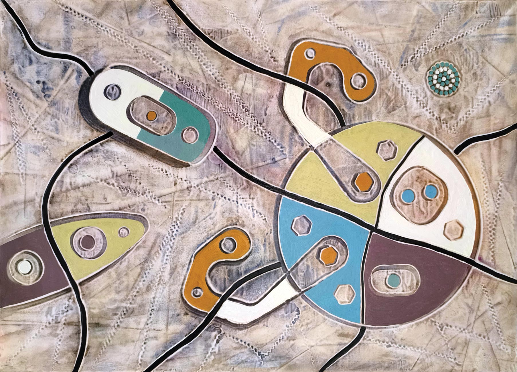 Movimenti spaziali, 2019, cm 80 x 100, oil and oxides on bas-relief in plaster on canvas