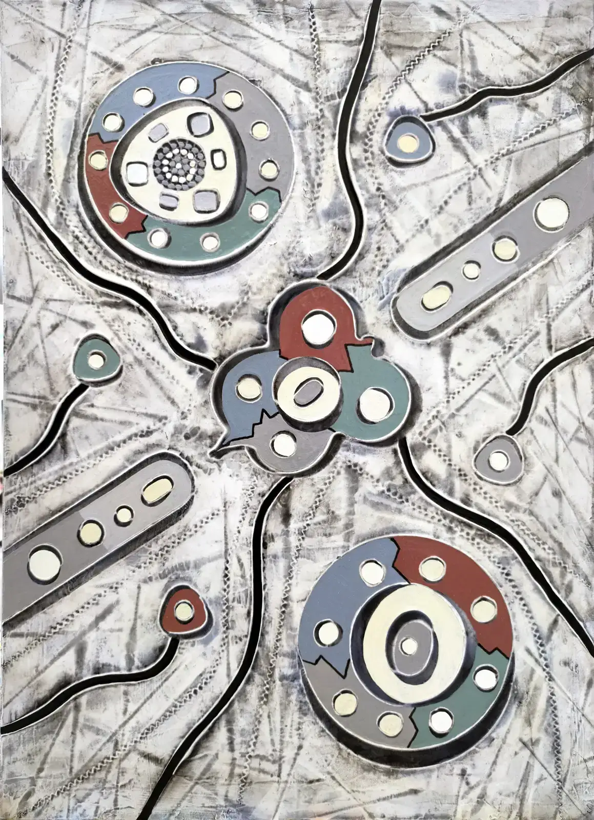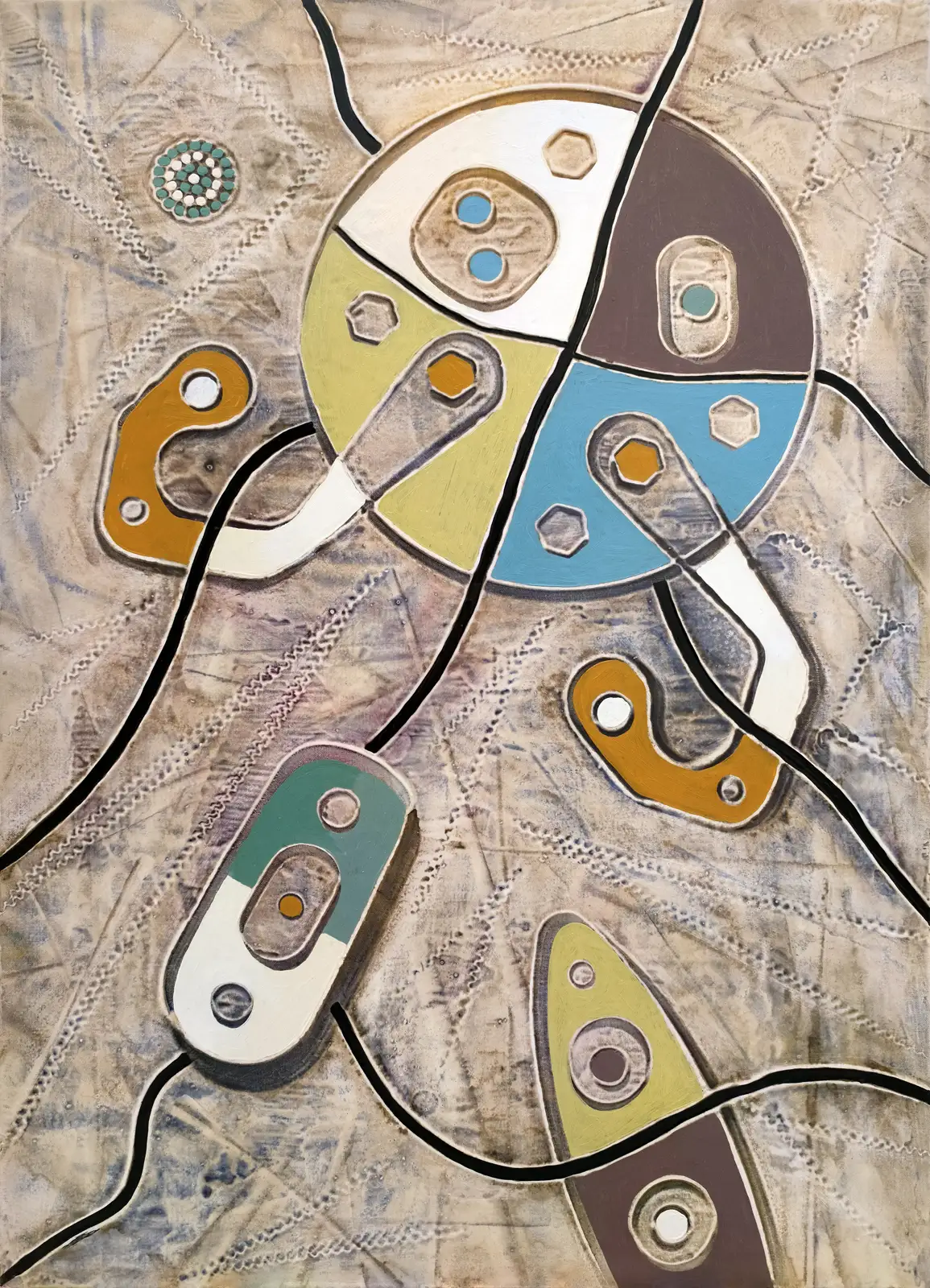 Tempo meccanico, 2020, cm 70 x 50, oil and oxides on bas-relief in plaster on canvas