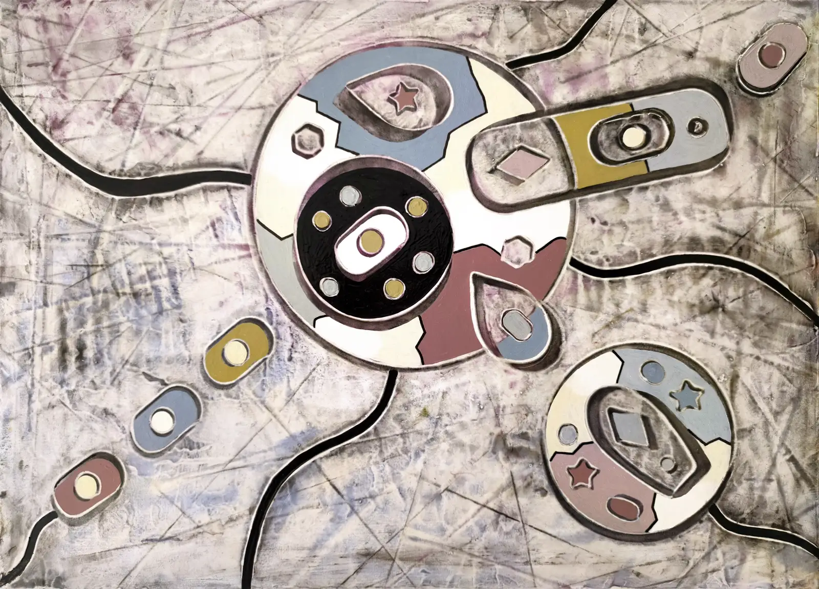 Movimenti spaziali, 2019, cm 80 x 100, oil and oxides on bas-relief in plaster on canvas