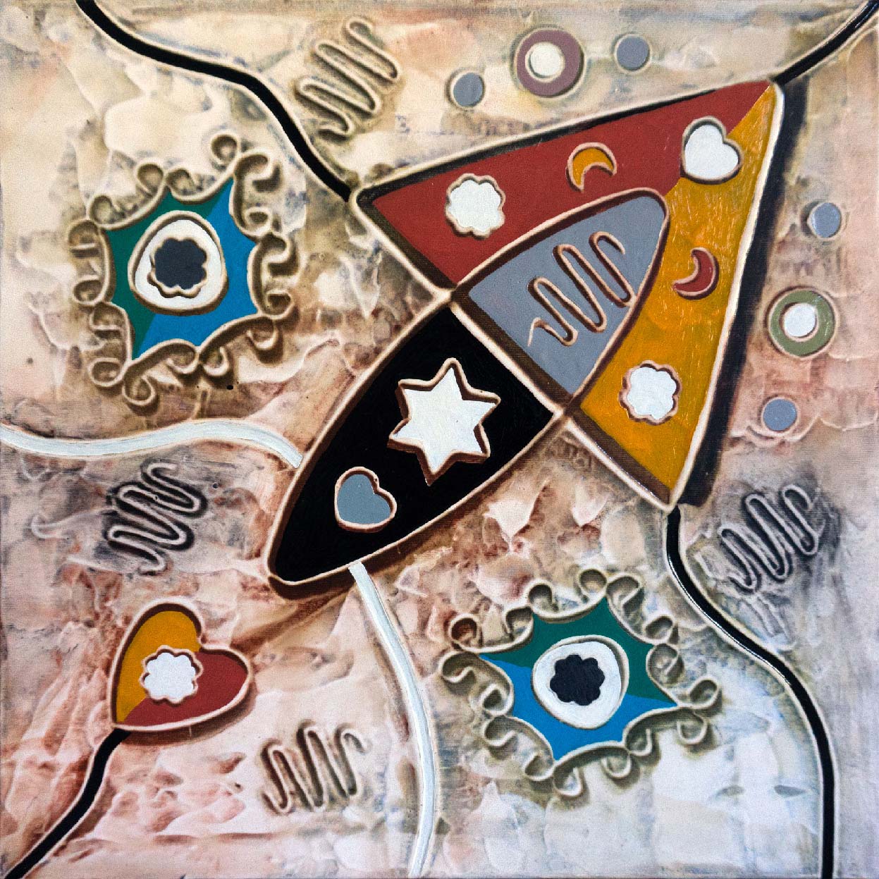 Passaggio generazionale, 2008, cm 40 x 40, oil and karkade on bas-relief in plaster on canvas