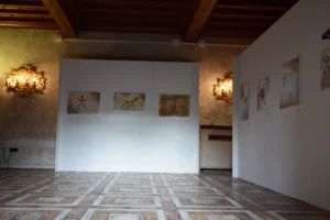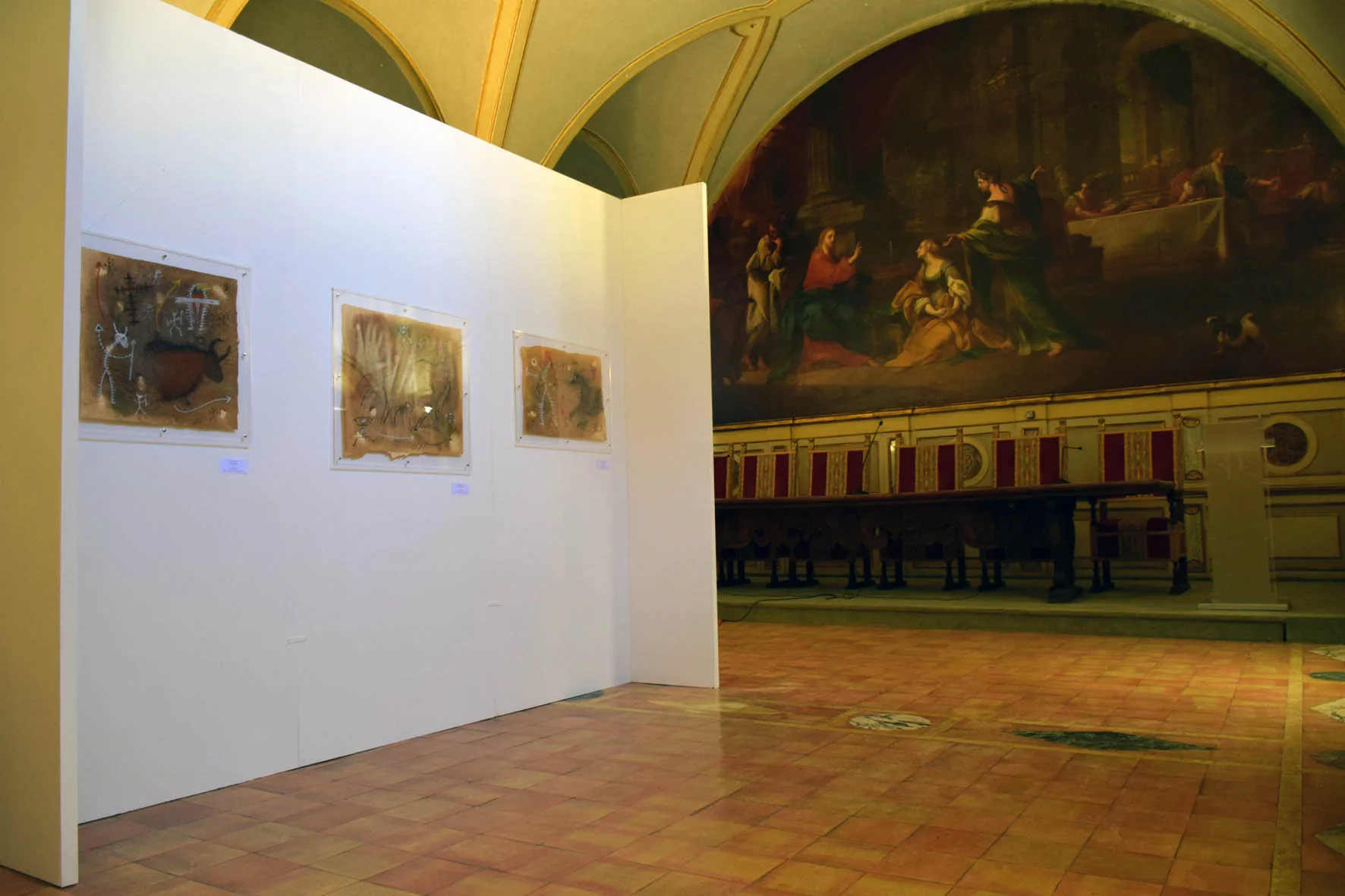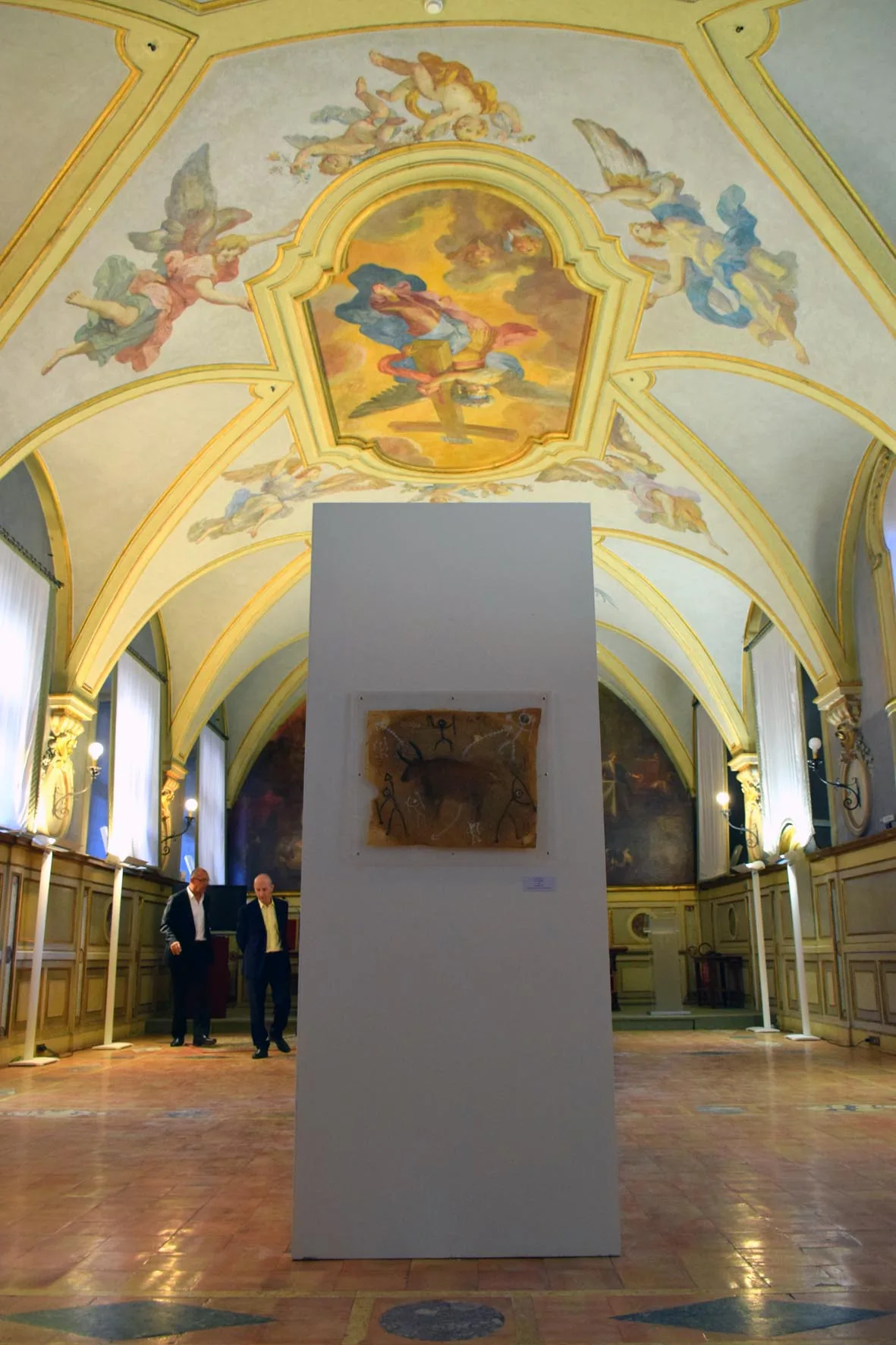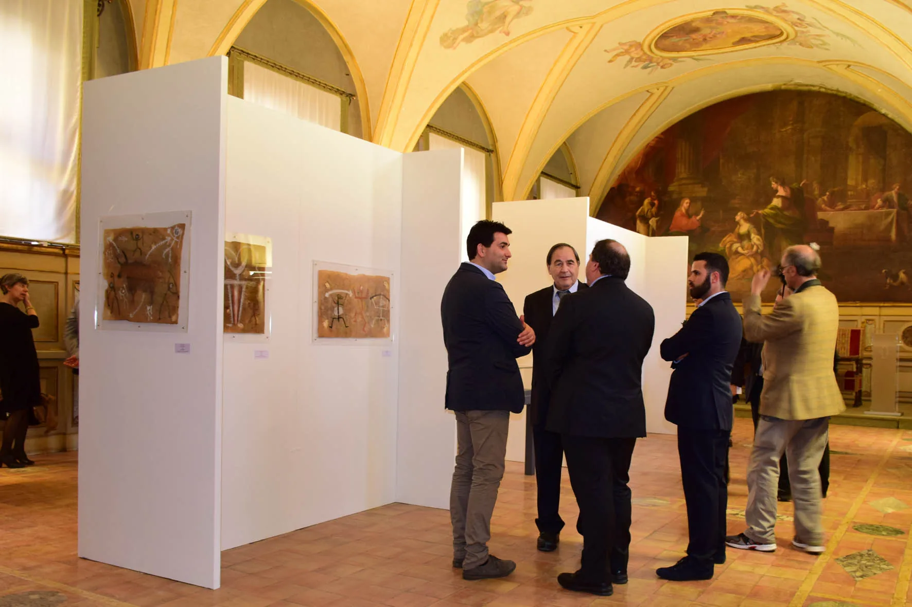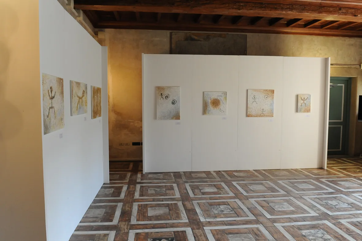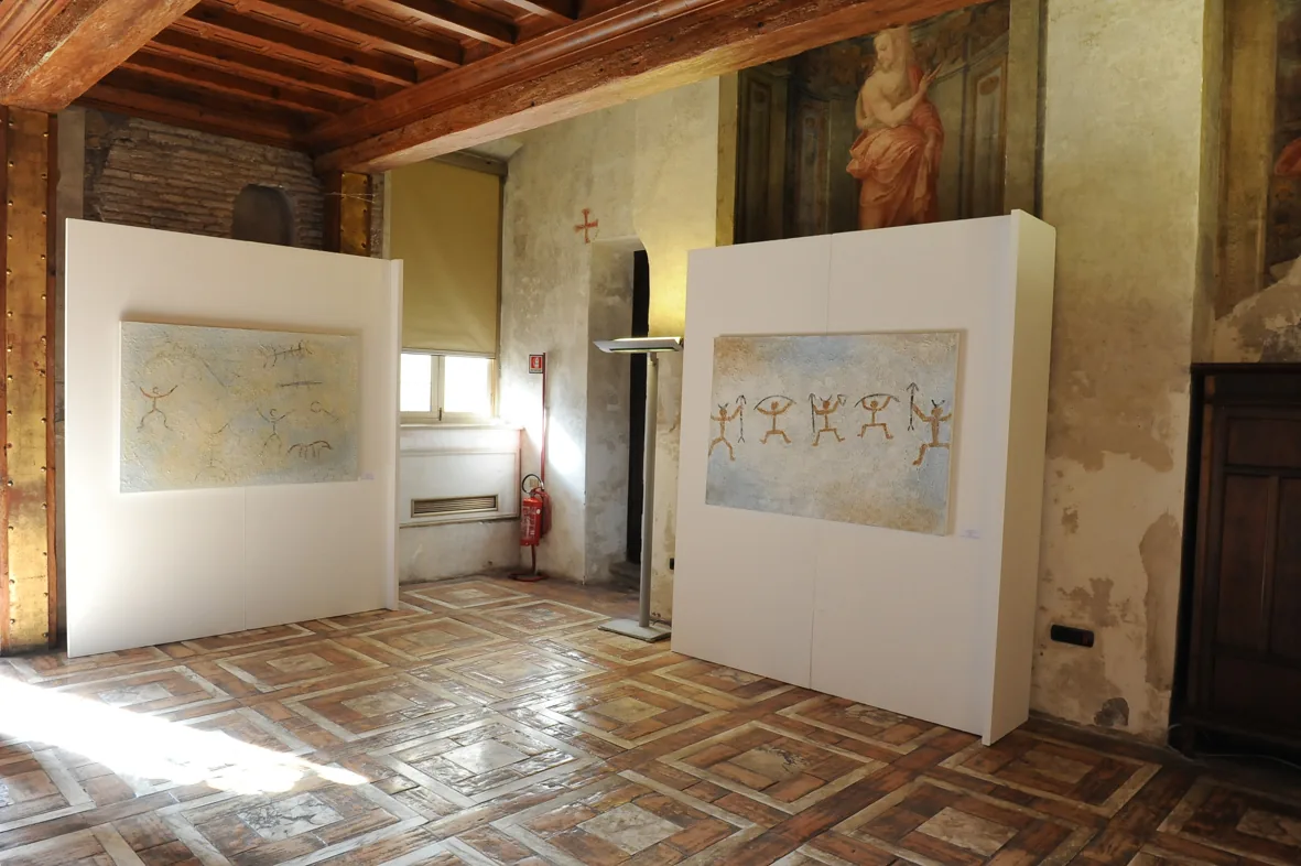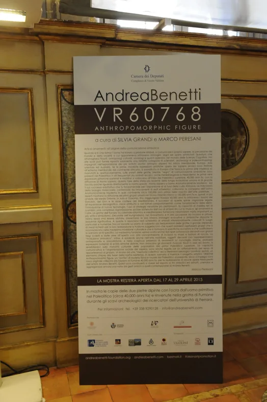 Andrea Benetti‘s works were exhibited at the Chamber of Deputies, in the Vicolo Valdina complex in Rome. Entitled “VR60768 anthropomorphic figures“, Andrea Benetti‘s exhibition, sponsored by the University of Ferrara and the University of Bologna, opened on April 16, 2015, curated by Professor Silvia Grandi and Professor Marco Peresani. The photo depicts the moment of the public presentation of the exhibition project, which included eleven drawings on paper by Montesanto, nine works on canvas made using pigments (loam, ochre, and charcoal) that were already used by prehistoric man around 40,000 years ago. Also on display were two stones painted during the Paleolithic period and found in Fumane Cave.